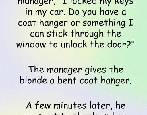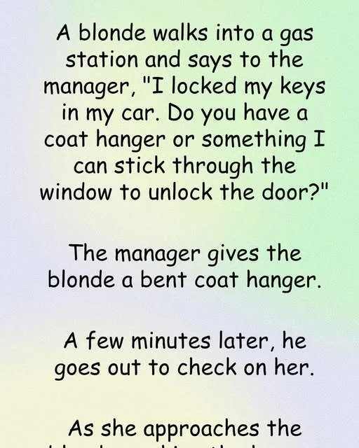 A blonde walks into a gas station and says to the manager, “I locked my keys in my car. Do you have a coat hanger or something I can stick through the window to unlock the door?”