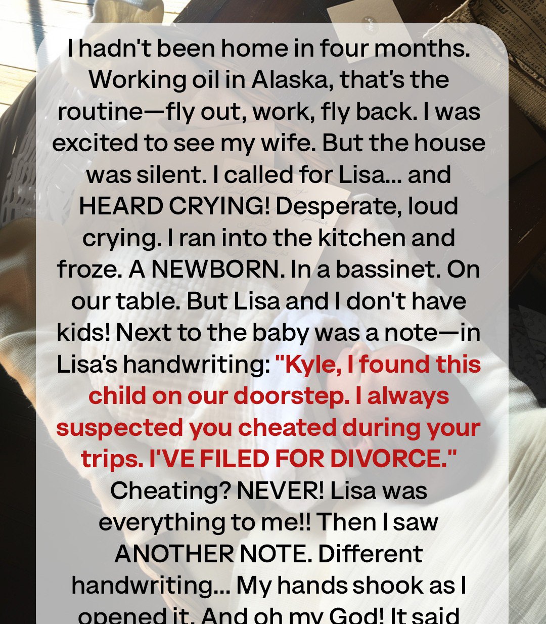 “Jake, I found this child on our doorstep. I always suspected you cheated during your trips. I’ve filed for divorce.”