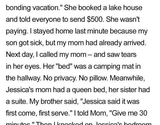 She tried to downplay it, but her eyes were red and her smile was forced. I knew then: Jessica had made her sleep on the floor. Furious, I called my brother Peter, expecting him to be horrified.Instead, he brushed it off, saying it was “first come, first serve” and that Mom was “tough.”