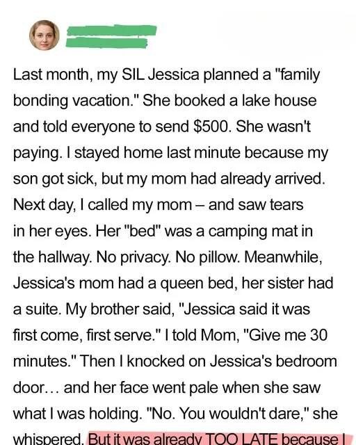 When my sister-in-law Jessica invited us all on a “dream family vacation” to a lake house, my mom was thrilled. She paid her $500 share with excitement, happy to spend time with her children and grandkids. But just two days before the trip, I had to cancel—my son spiked a high fever.