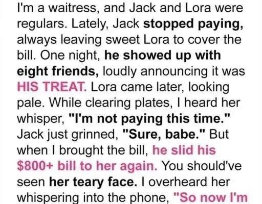 I’ve been a waitress at a fancy downtown restaurant for ten years, but nothing shocked me like the night Jack strutted in with eight rowdy friends and expected his wife, Lora, to cover their $800+ bill. They used to be a sweet couple. Now, Jack indulged in lavish meals, and Lora paid every time, her face more strained each visit.