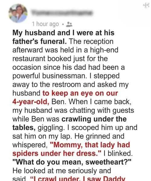 While I was briefly speaking with relatives, he had crawled under the tables, giggling softly as only a child could — innocent and oblivious. When I found him moments later, his expression was strangely serious. He tugged on my dress and whispered, “Mommy, I saw Daddy touch another lady’s leg.”