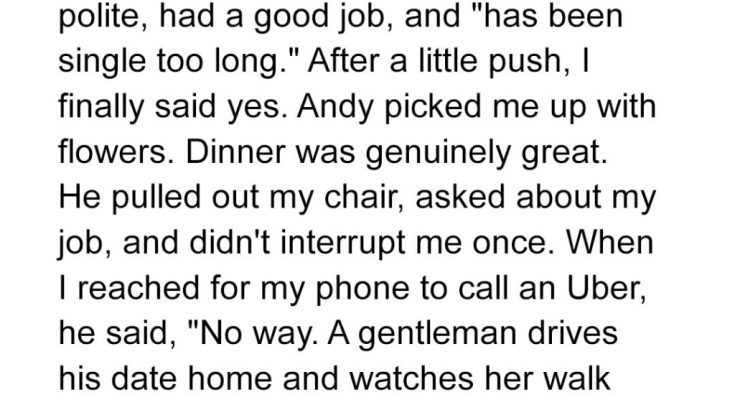He opened the car door like we were living in 1954, drove me all the way home without checking his phone once, and stayed parked until I got to my door.