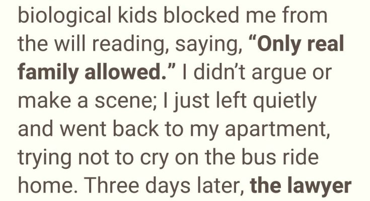 That hope lasted less than a minute. His biological children—people I had lived alongside but never truly known—blocked the doorway to the lawyer’s office. One of them didn’t even look me in the eye when they said it.