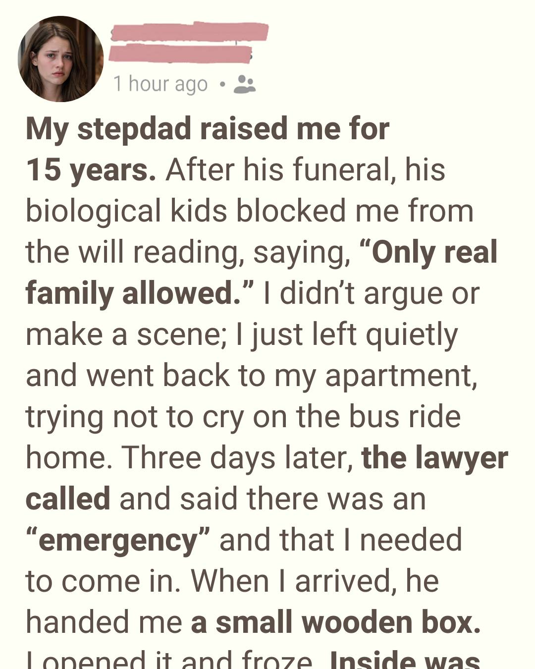 When I arrived, the office was empty and silent. The lawyer motioned for me to sit, then disappeared into the back room. When he returned, he was holding a small wooden box, worn smooth at the edges.