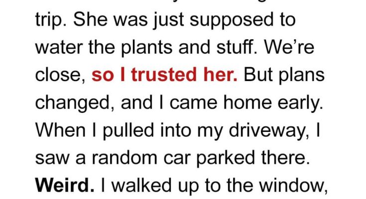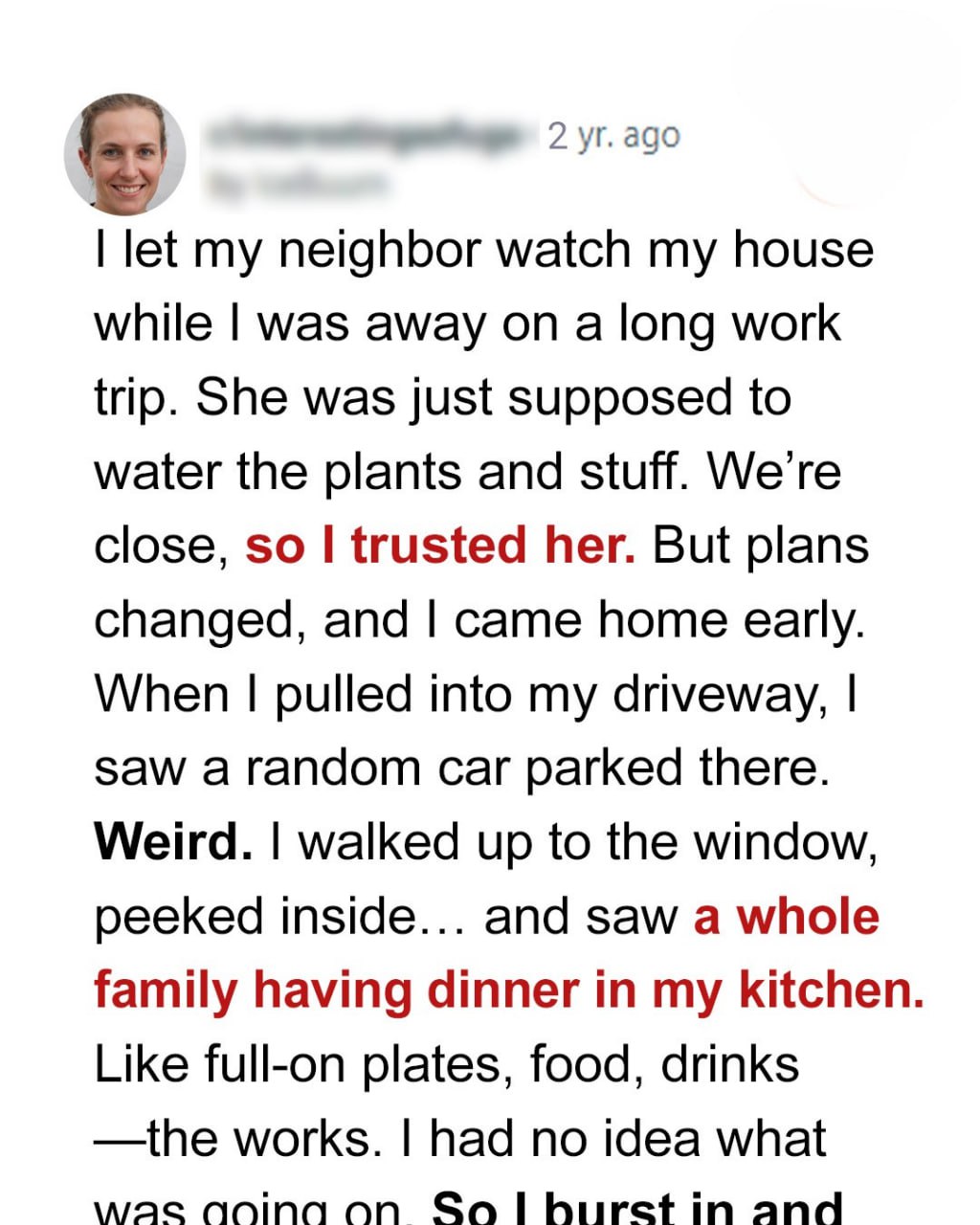 I left for a month-long work trip, trusting my neighbor and friend to watch my house. But when I returned early, I found a strange car in the driveway… and a family of strangers eating dinner in my kitchen!The air smelled like late summer — warm pavement and cut grass — as I handed Lisa my house keys.“Just the usual,” I said with a tired smile, heaving my luggage into the trunk with a solid thunk. “Water the indoor plants and the garden, maybe check the mail.”