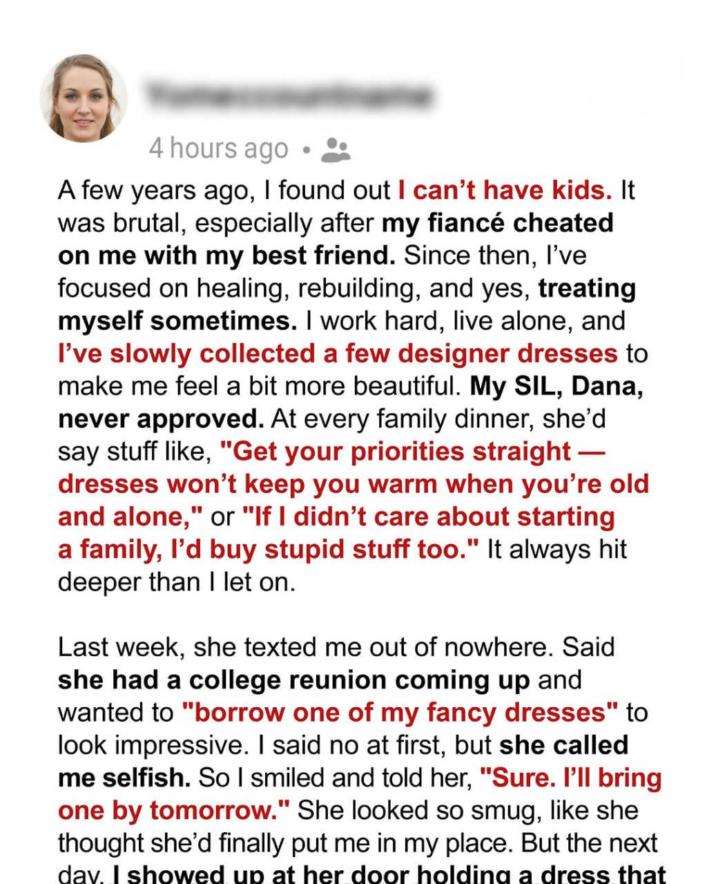 My SIL Shamed Me for Spending Money on Designer Dresses—Then Demanded I Lend Her One for a Party