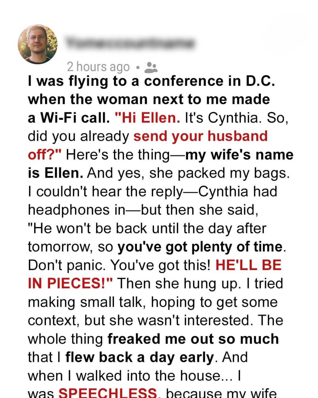 On a flight to D.C., a husband overhears a chilling call: “Did you send your husband off?” followed by, “He’ll be in pieces.” The caller? A stranger. The name she used? His wife’s. Panic takes hold — what is Ellen hiding? He flies home early… and what he finds leaves him speechless.I was settling into my aisle seat when the woman in 12B said my wife’s name during her phone call.