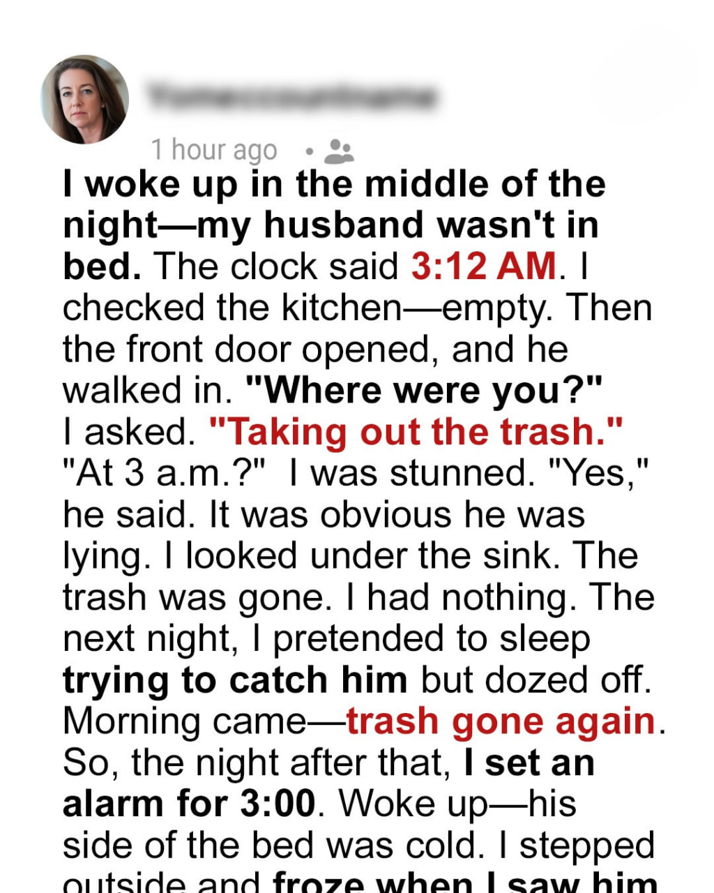 After 22 years of marriage, my husband suddenly started taking the trash out at 3 a.m. He’d never volunteered for it… not once. So why now? One night, I followed him and what I discovered broke my heart in ways I wasn’t ready for.I’m Lucy, 47, and I’ve been married to Dave for 22 years. We’ve got two grown kids who pop in for Sunday dinners, but mostly it’s just me and him now with our traditional morning coffee, grocery runs, and soft arguments about thermostat settings.