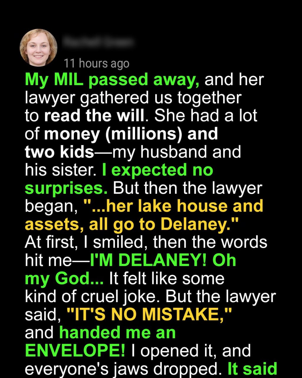 “…the entirety of her estate — including the lake house, primary residence, all assets and savings — shall be inherited by… Delaney S****.”
