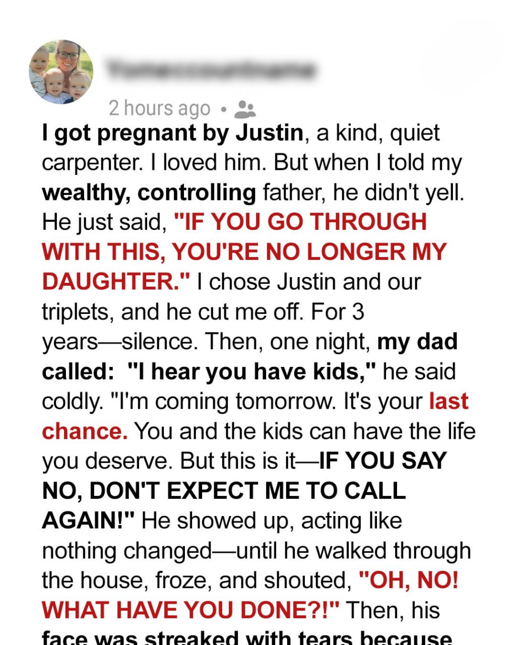 I stepped aside, letting him walk through the door. He moved slowly, inspecting everything as though he were a judge on some reality show. His gaze lingered on the hardwood floors Lucas had installed, the family photos lining the walls, and the corner where the triplets’ toys were neatly stacked. His face was unreadable, but his silence was deafening.