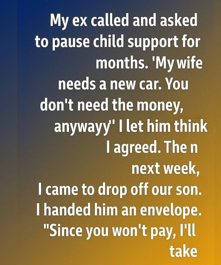I let him think I agreed. The next week, when I came to drop off our son, I handed him an envelope. “Since you won’t pay, I’ll take responsibility in a different way,” I said calmly.