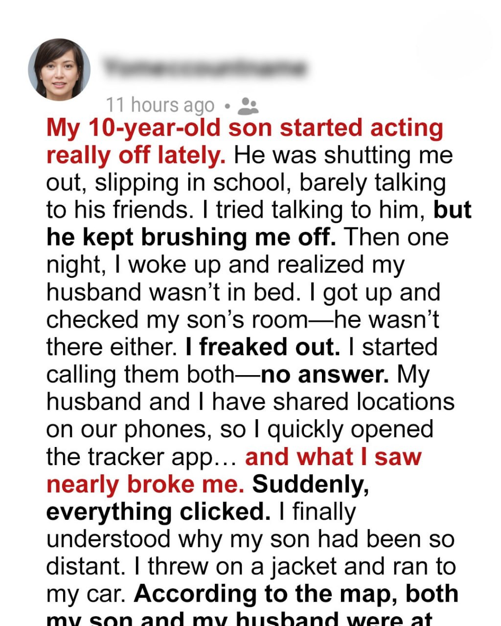 When my 10-year-old son started acting distant, I chalked it up to mood swings and figured it was just a phase. But one night, I woke up and realized he and my husband were both gone… and nothing could have prepared me for where I’d find them.