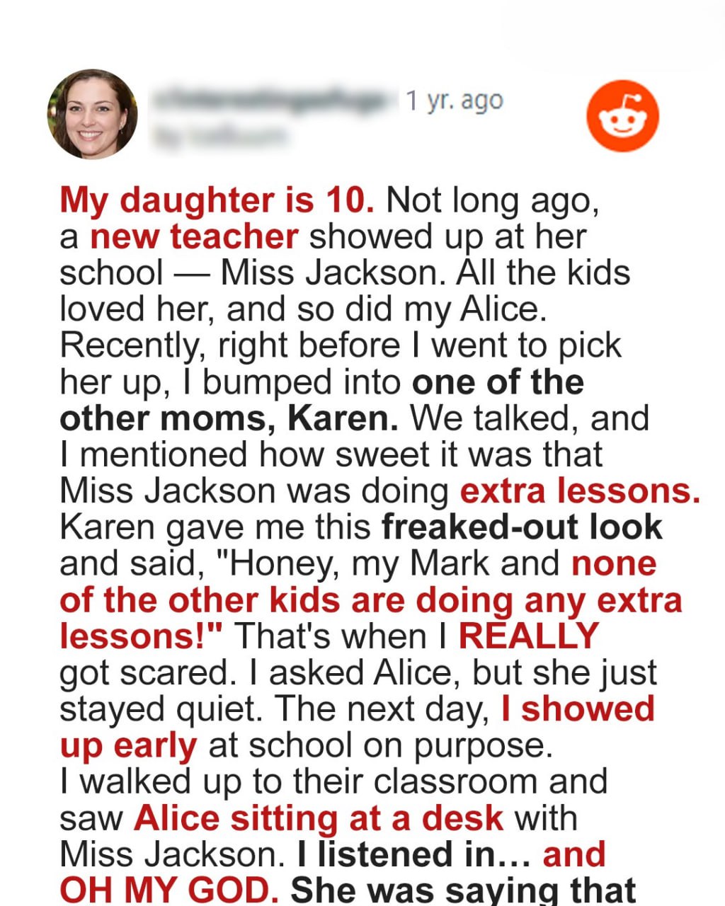 When my daughter’s teacher started holding private lessons with her, I thought she was just being helpful. But when I overheard a conversation between them, everything changed. The truth I uncovered was something I never expected and left me questioning everything.I think only moms will fully understand me. But when you have a child, you are ready to do anything to provide them with the utmost care and comfort. Anything.