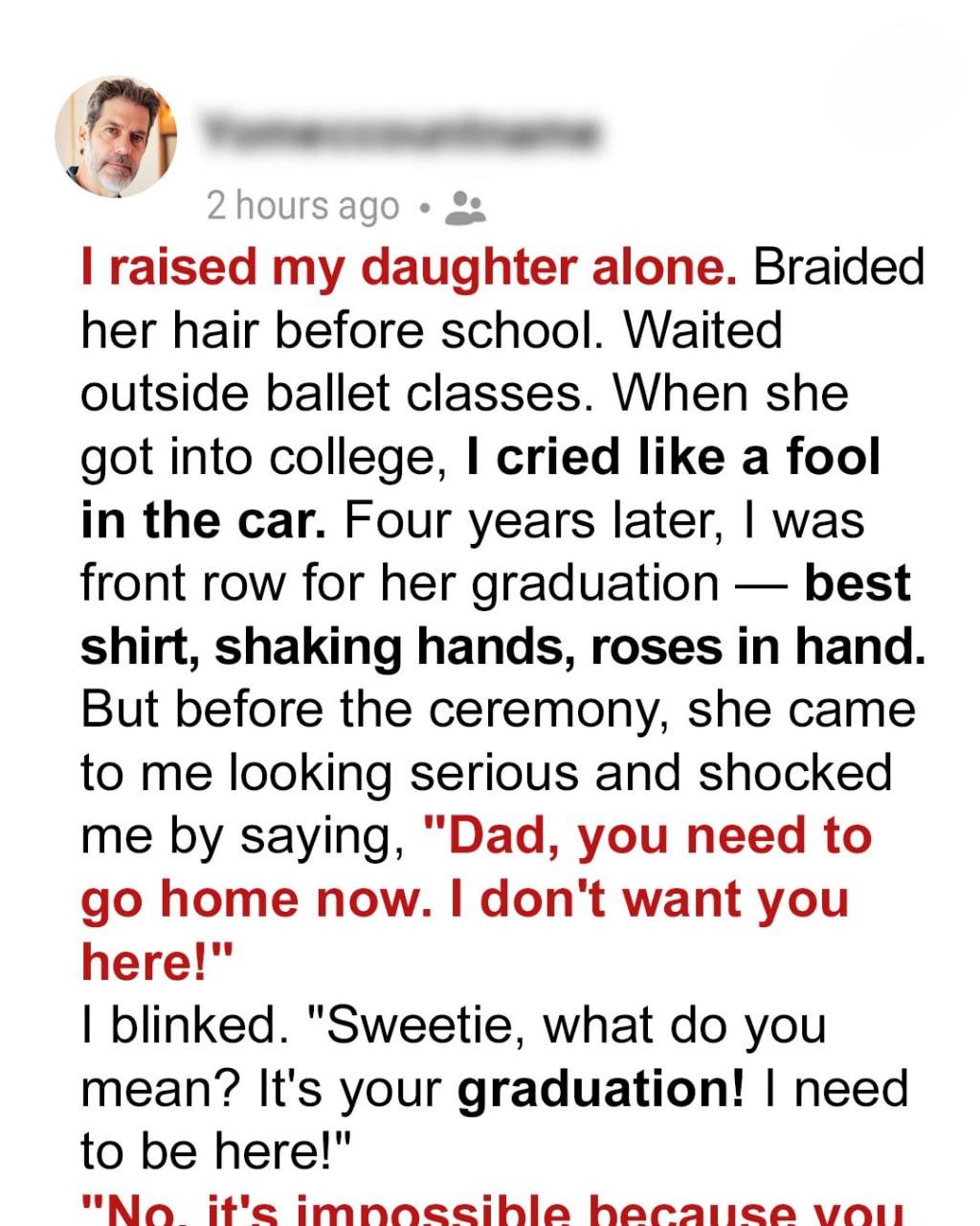 My daughter is my world. I raised her alone with love, grit, and everything I had. I never missed a milestone. Seated in the front row at her graduation ceremony, I was the proudest dad alive… until she asked me to leave. Her reason cut deep… but I knew I had to fight for her again.