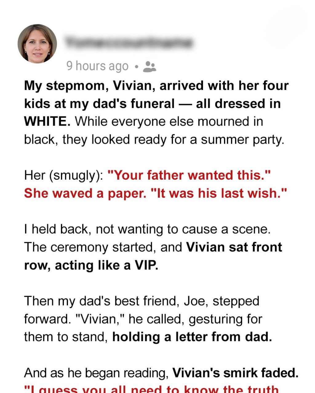 And then they showed up.Vivian, my stepmom, waltzed in like she was on a runway, her four adult kids trailing behind her, all dressed in white. Stark, glaring white — like they’d gotten lost on the way to a fancy yacht party.Everyone else was draped in black, heads bowed, grieving. But not them. No, they strutted in like they were attending some exclusive event, turning heads for all the wrong reasons.