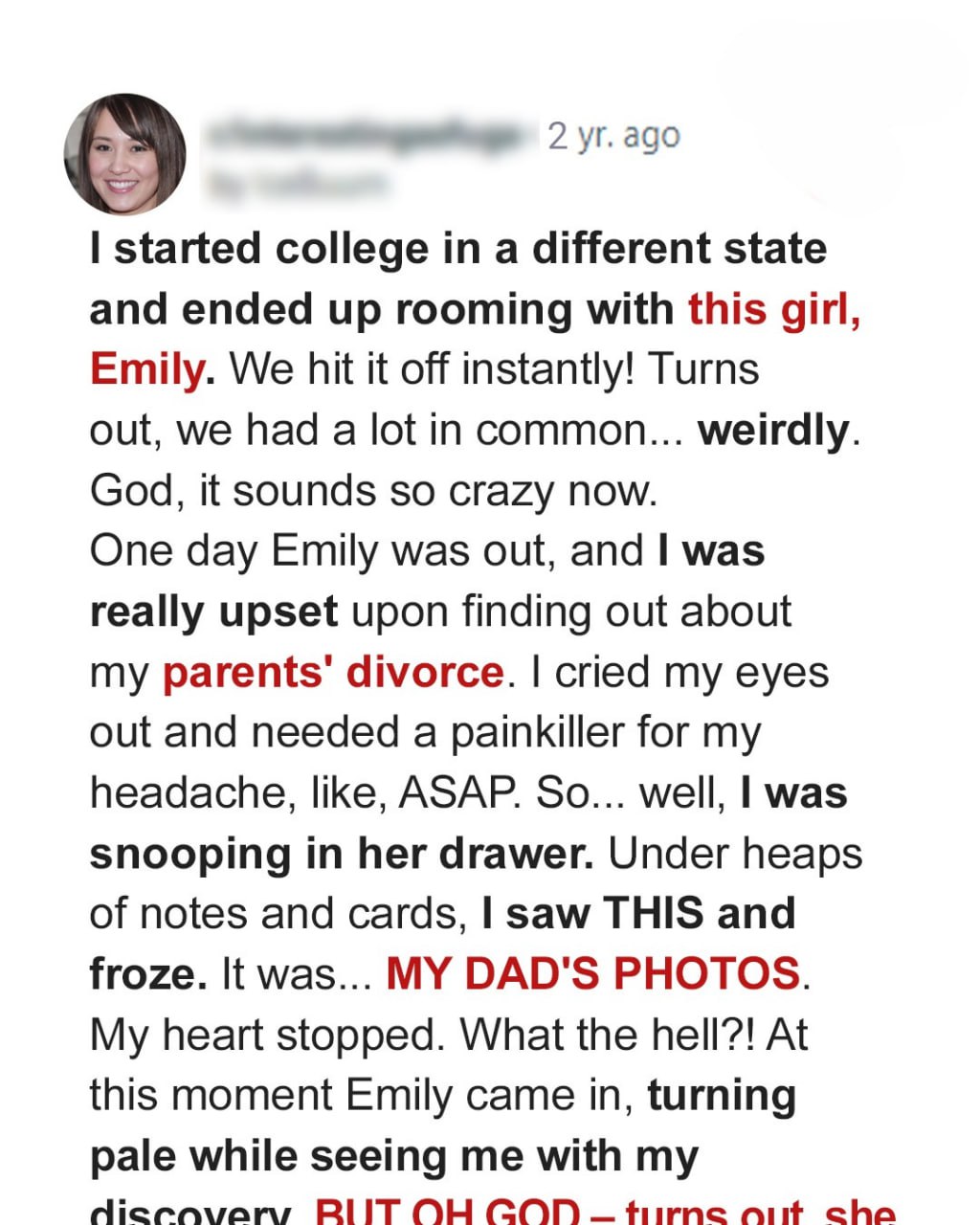 My roommate, Emily, and I were close until I found photos of my dad in her bedside drawer. She claimed they were harmless, but the intimate hug I saw between Dad and her later suggested otherwise. Feeling betrayed, I rashly intervened to keep them apart.