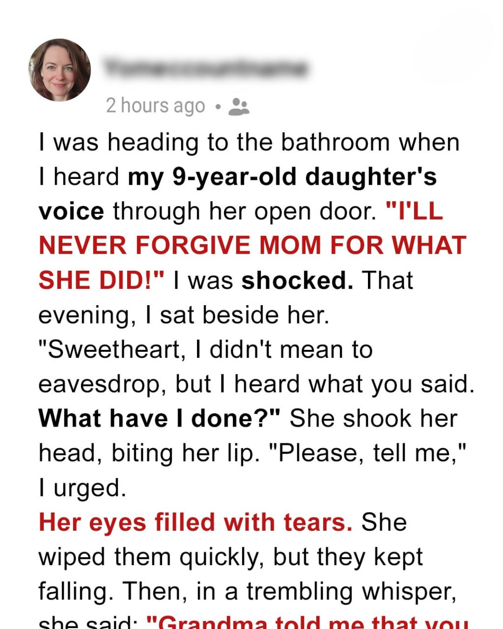 “Hailey, I didn’t mean to eavesdrop, but I heard what you said on the phone today,” I admitted, trying to keep my voice gentle. “What have I done that you can’t forgive?”