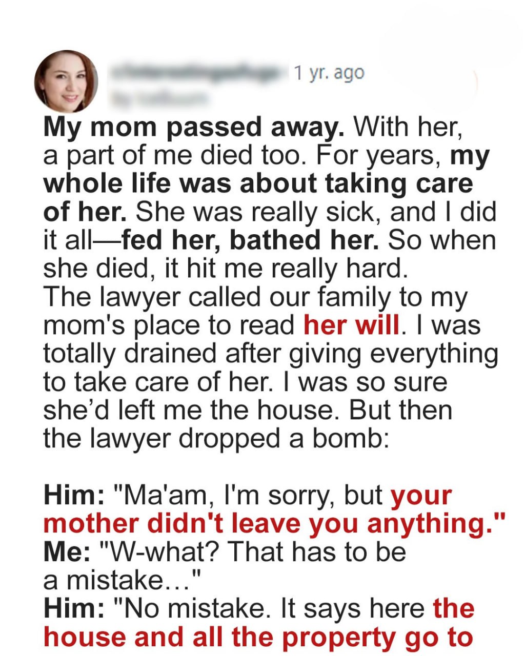 I cared for my mother through her final days, sacrificing everything to be by her side. Yet, when the will was read, I was left with nothing. The betrayal cut deep, but the truth behind her decision and the secrets that followed changed everything I thought I knew about my family—and myself.Beside me in the car, Dan sat silently, smelling faintly of alcohol. He’d promised me he stopped drinking, but the familiar smell told me otherwise. Honestly, I was close to my breaking point.