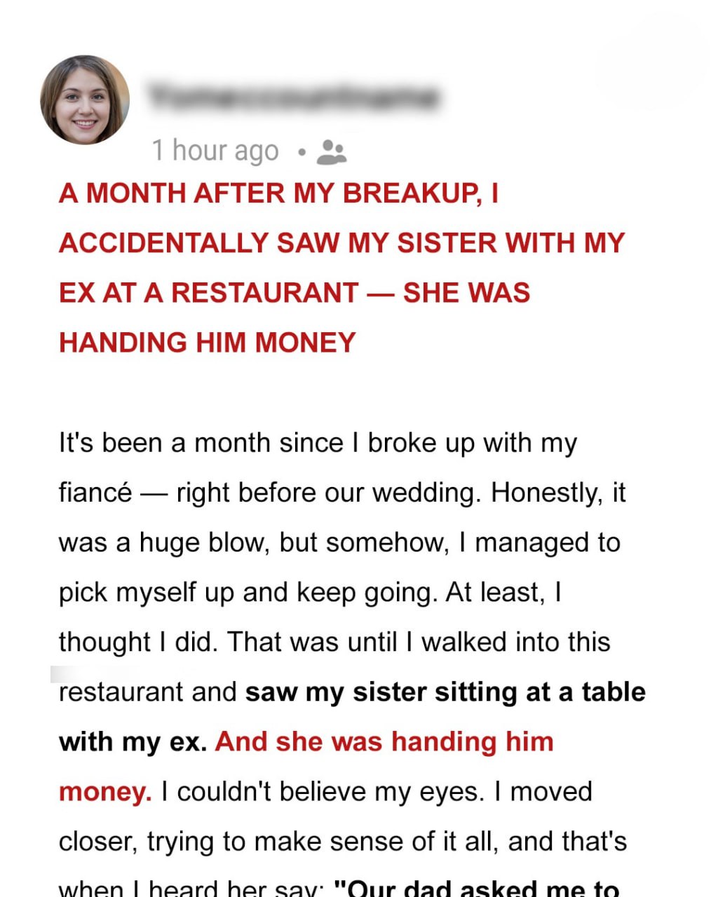 A month after my breakup, I was finally moving on when I stumbled upon my sister handing money to my ex-fiancé, the man who shattered my heart. My heart pounded. Were they together? Was she betraying me? The truth was worse than I ever imagined.