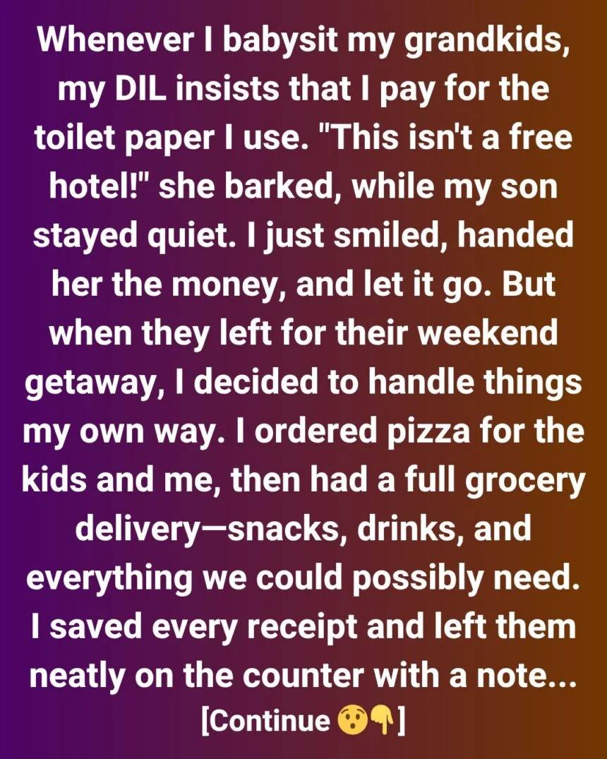 Whenever I babysit my grandkids, my daughter-in-law insists that I pay for the toilet paper I use. “This isn’t a free hotel!” she snapped once, while my son stood by, silent. I just smiled, handed her the money, and let it go.
