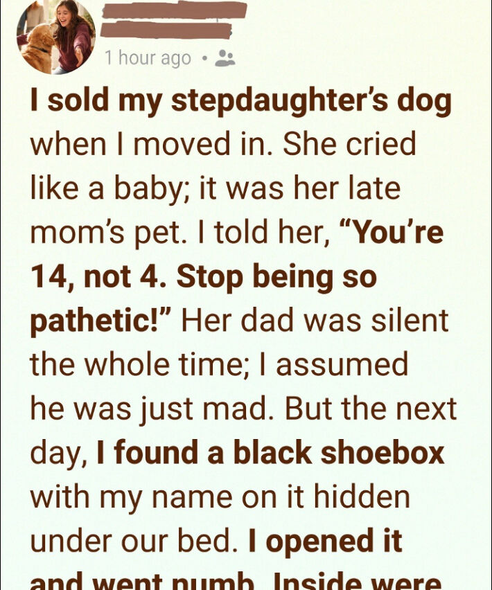 The next morning, while I was obsessively vacuuming under our bed—cleaning away the last of the phantom dog hair—my hand hit something solid. I pulled out a black shoebox. My name was scrawled on the lid in the uneven, looping handwriting of a teenager trying to be neat.
