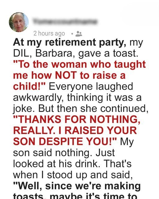 Then, it was time for the toasts. Colleagues shared anecdotes. Friends recalled adventures. My son spoke beautifully, his voice thick with emotion, praising my dedication. I felt tears prick my eyes. This is everything I worked for.