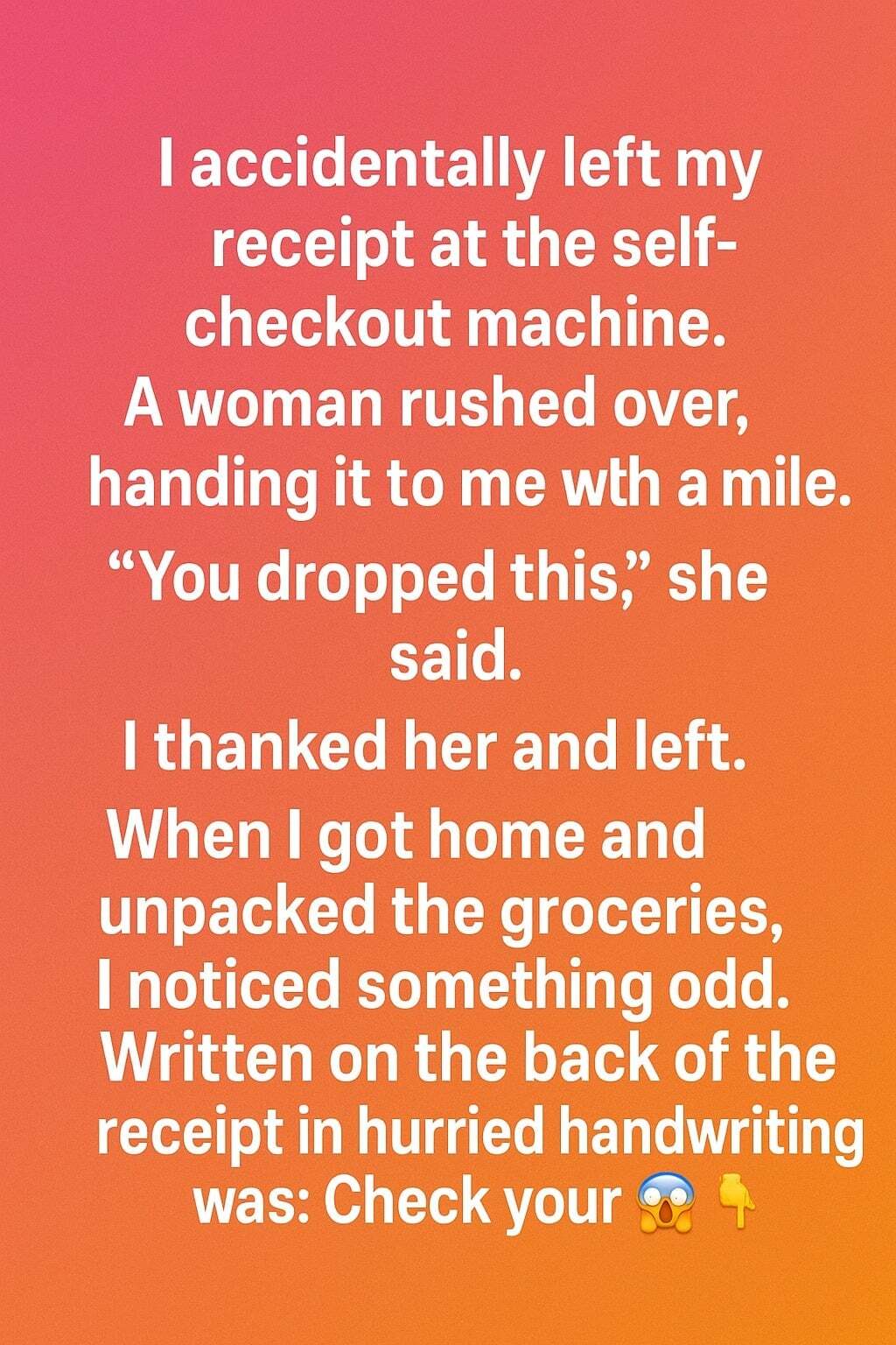 I accidentally left my receipt at the self-checkout machine. A woman rushed over, handing it to me with a warm smile. “You dropped this,” she said softly.
