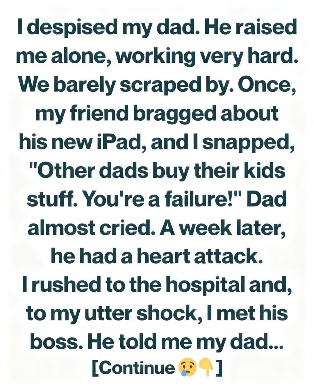 My dad suffered a heart attack, and I rushed to the hospital, my cruel words replaying in my head. As I waited, a man approached me—my father’s boss. When he realized who I was, he shared things I’d never known: my dad arrived first, left last, took unwanted shifts, and turned down better-paying jobs so he wouldn’t leave me alone.