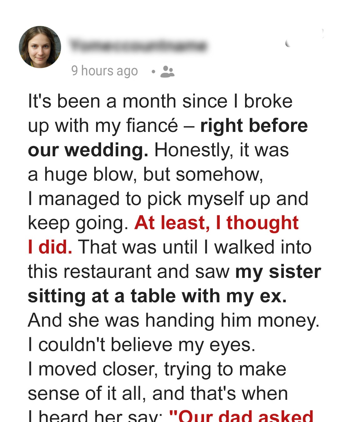 A Month After My Breakup, I Accidentally Saw My Sister with My Ex at a Restaurant — She Was Handing Him Money