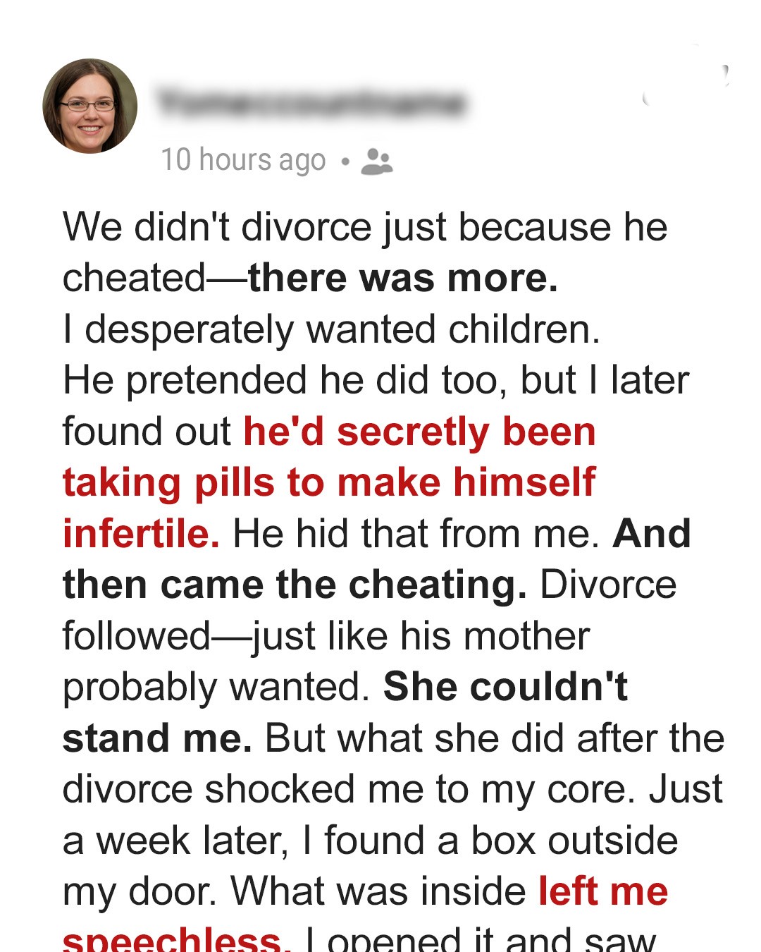 For five years, Claire dreamed of starting a family — only to discover her husband had been keeping a devastating secret. After the betrayal and a brutal divorce, she thought it was over. Until a week later, a box appeared on her doorstep… and what was inside left her reeling.