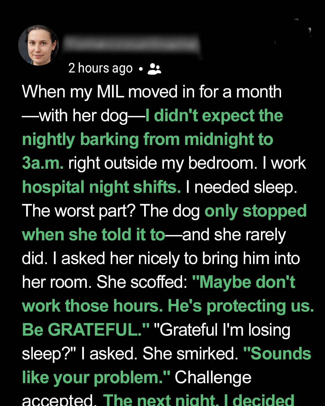 When my MIL moved in for a month, I had no idea her little mixed-breed dog would spend every evening howling outside my bedroom. I begged her to control him, but she laughed in my face: “Sounds like your problem, not his.” Oh really? That’s when I decided to make it her problem!I knew it would be challenging to live with my MIL for a month while their home was being renovated, but I never imagined her dog would be the worst part of it.
