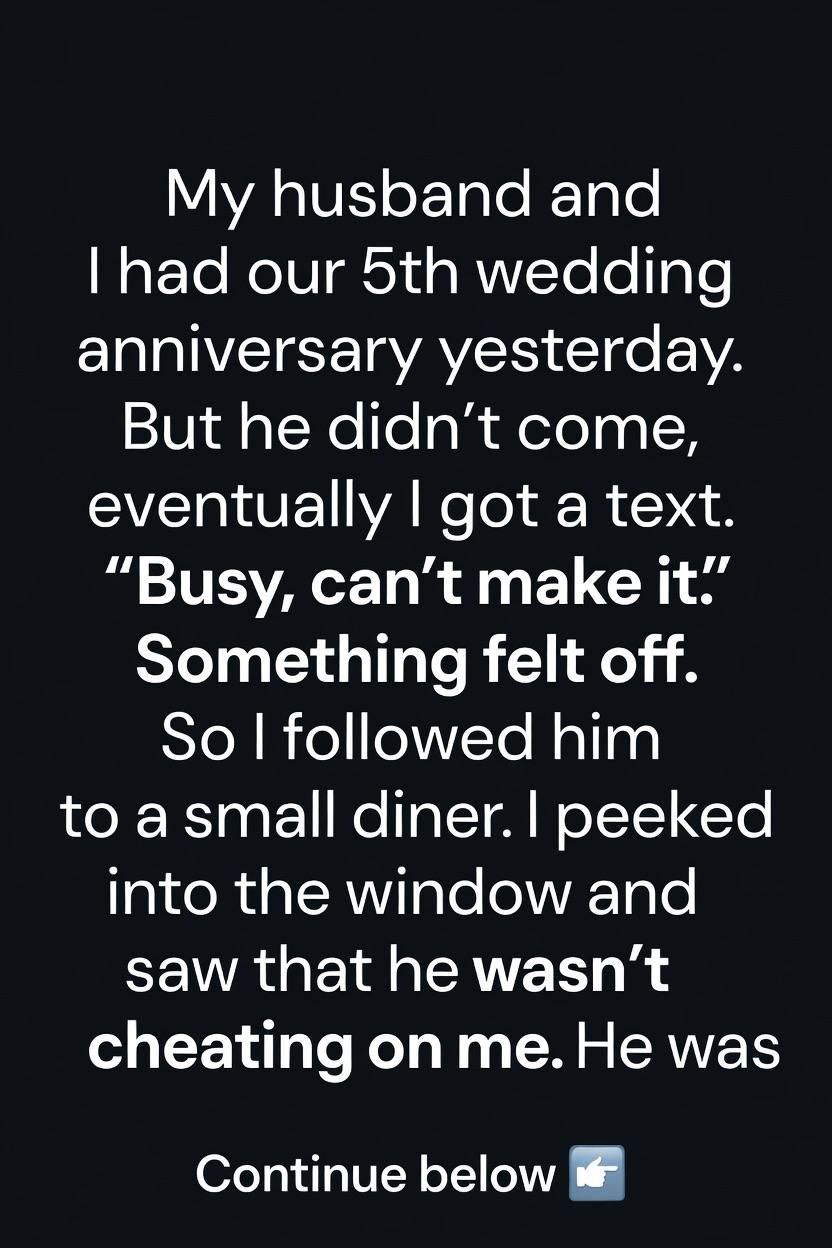 Something about his message felt off and unsettled me deeply. The next day, my curiosity and concern got the better of me, so I decided to follow him. I saw him enter a small, quiet diner and my heart pounded as I peeked through the window.