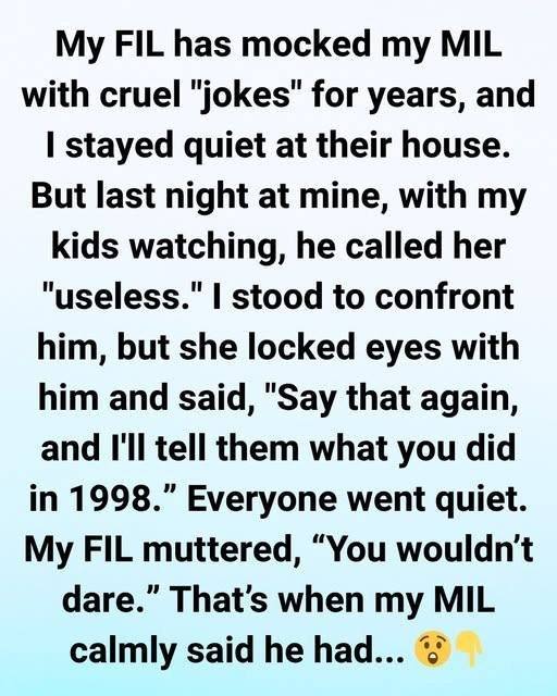 I think it’s fair they know why you avoided family gatherings that whole summer.” My FIL looked down, his face pale, and didn’t say another word. My kids watched quietly as the tone of the evening shifted from mockery to respect. After they left, my MIL thanked me for always trying to defend her, but said tonight was about finally defending herself.