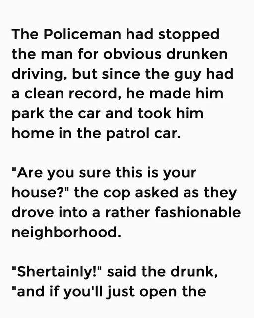 but since the guy had a clean record, he made him park the car and took him home in the patrol car. “Are you sure this is your house?” the cop asked as they drove into a rather fashionable neighborhood. “Shertainly!” said the drunk, “and if you’ll just open the door f’me, I can prove it to ya.”