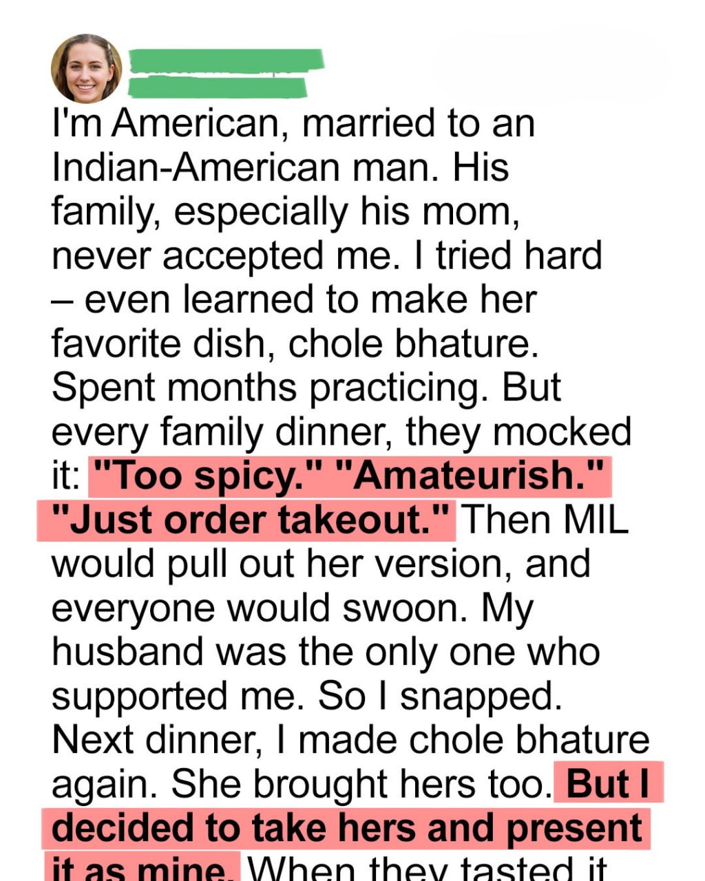 Every dish I made for my husband’s family was met with criticism and side-eyes, no matter how hard I tried to win them over. But one dinner, that involved a secret plan, everything changed.I’m an American woman, married to an Indian-American man named Raj. From the moment I met his family, especially his mother, Priya, I could feel the wall. Little did I know that I’d be forced to bring that wall down.