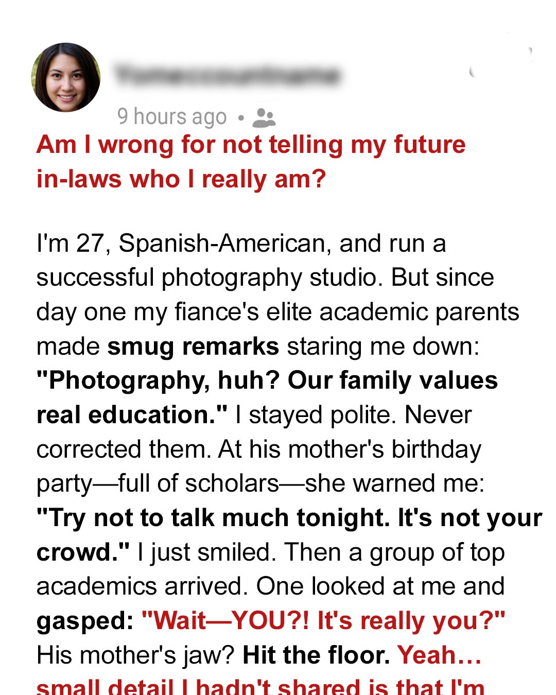 So here’s my question for you: Am I wrong for not telling my future in-laws about my background? Should I have announced my credentials from day one to avoid their condescension? Or is it okay to let people reveal their true character before deciding if they deserve to know your whole story?