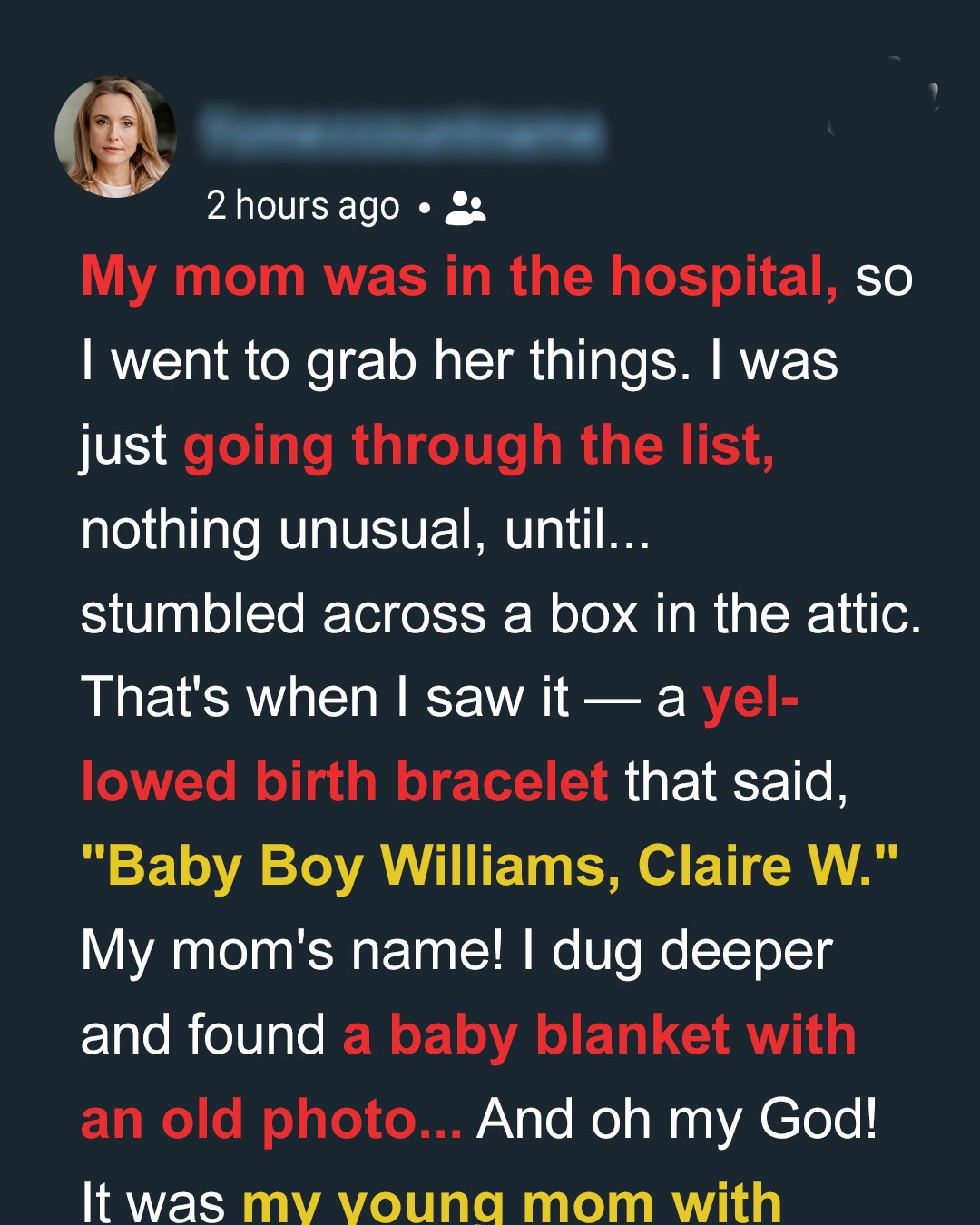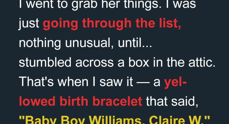 I expected the usual: old photo albums or yellowed papers she hadn’t used in years. Instead, my hand froze as I pulled out a small, yellowed hospital bracelet.The text on it blurred as I reread the name over and over:“Baby Boy Williams, 12-15-83, Claire W.”