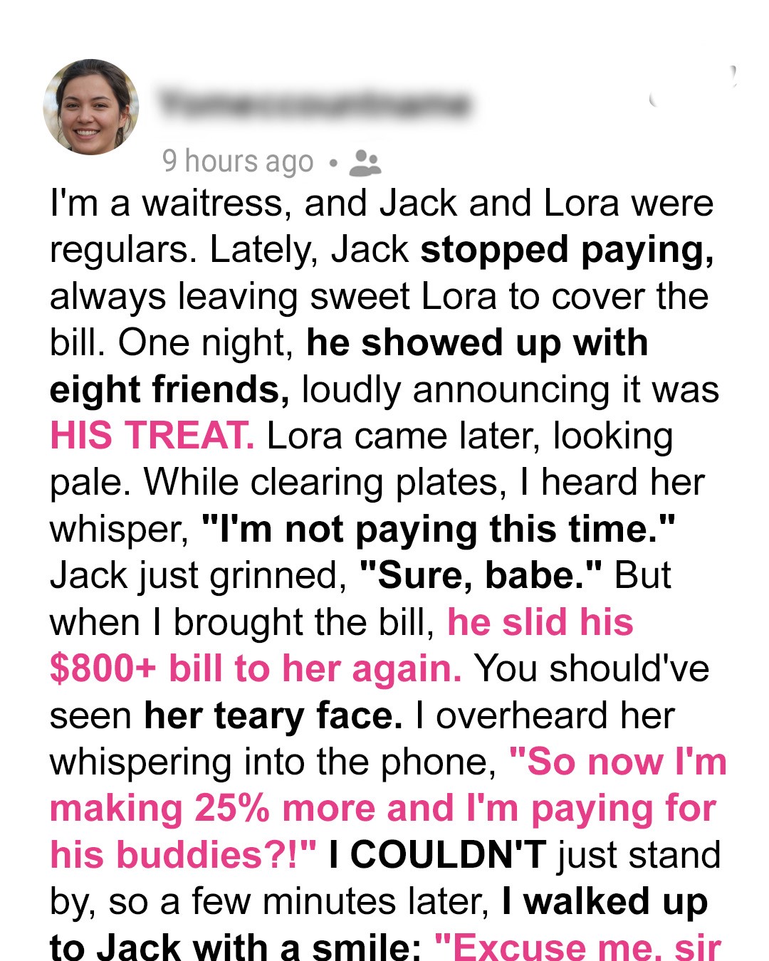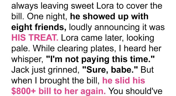 Eight hundred dollars plus. That’s what Jack’s “boys’ night out” bill came to, and he expected his wife, Lora, to foot it. Waitress Melanie, witnessing Lora’s despair, concocted a bold move to ensure Jack’s night didn’t end as he planned.Ten years. That’s how long I’ve been slinging plates at one of the fanciest restaurants downtown. You see all sorts of folks in this line of work, couples on first dates practically glowing, families celebrating birthdays with sticky-fingered toddlers, and the occasional business lunch that looks more like an interrogation than a meeting.