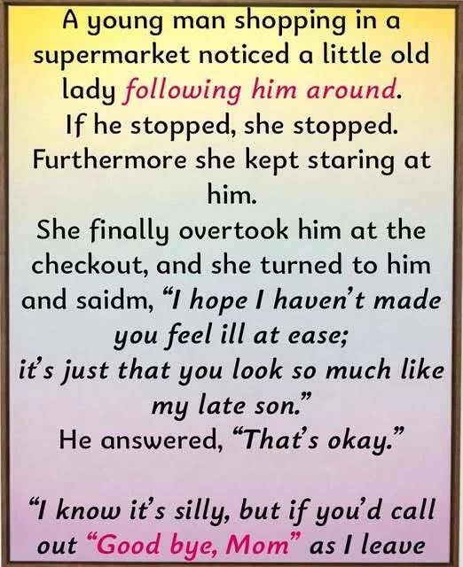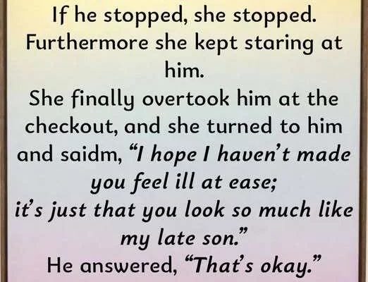 She finally overtook him at the checkout, and she turned to him and saidm, “I hope I haven’t made you feel ill at ease; it’s just that you look so much like my late son.”