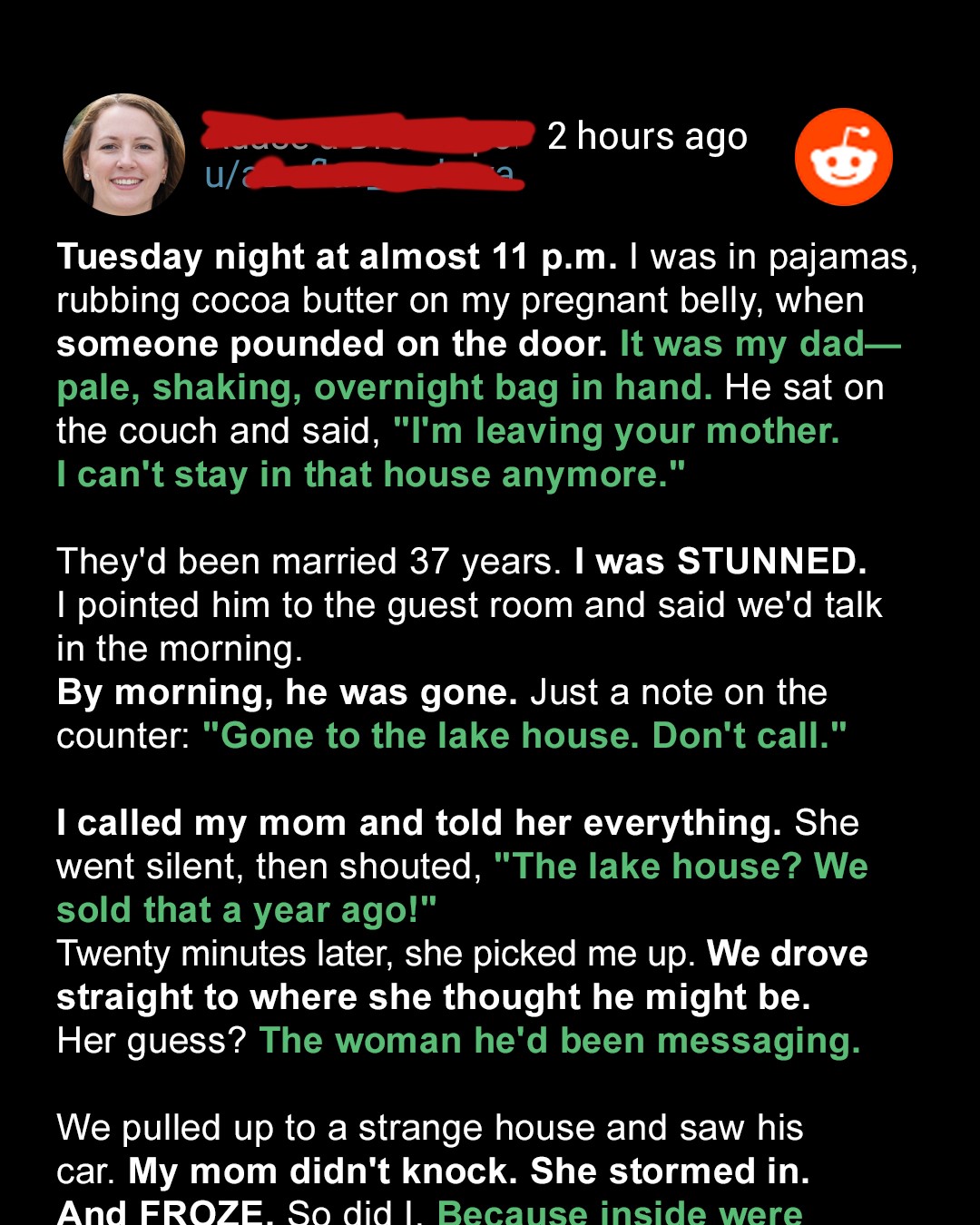 When Dad appeared on my doorstep at 11 p.m. with a packed bag, telling me he was divorcing my mom, I was more than just shocked. But as the night unfolded, I realized his strange behavior hinted at something far more disturbing than just marital problems.Life had been pretty perfect lately.