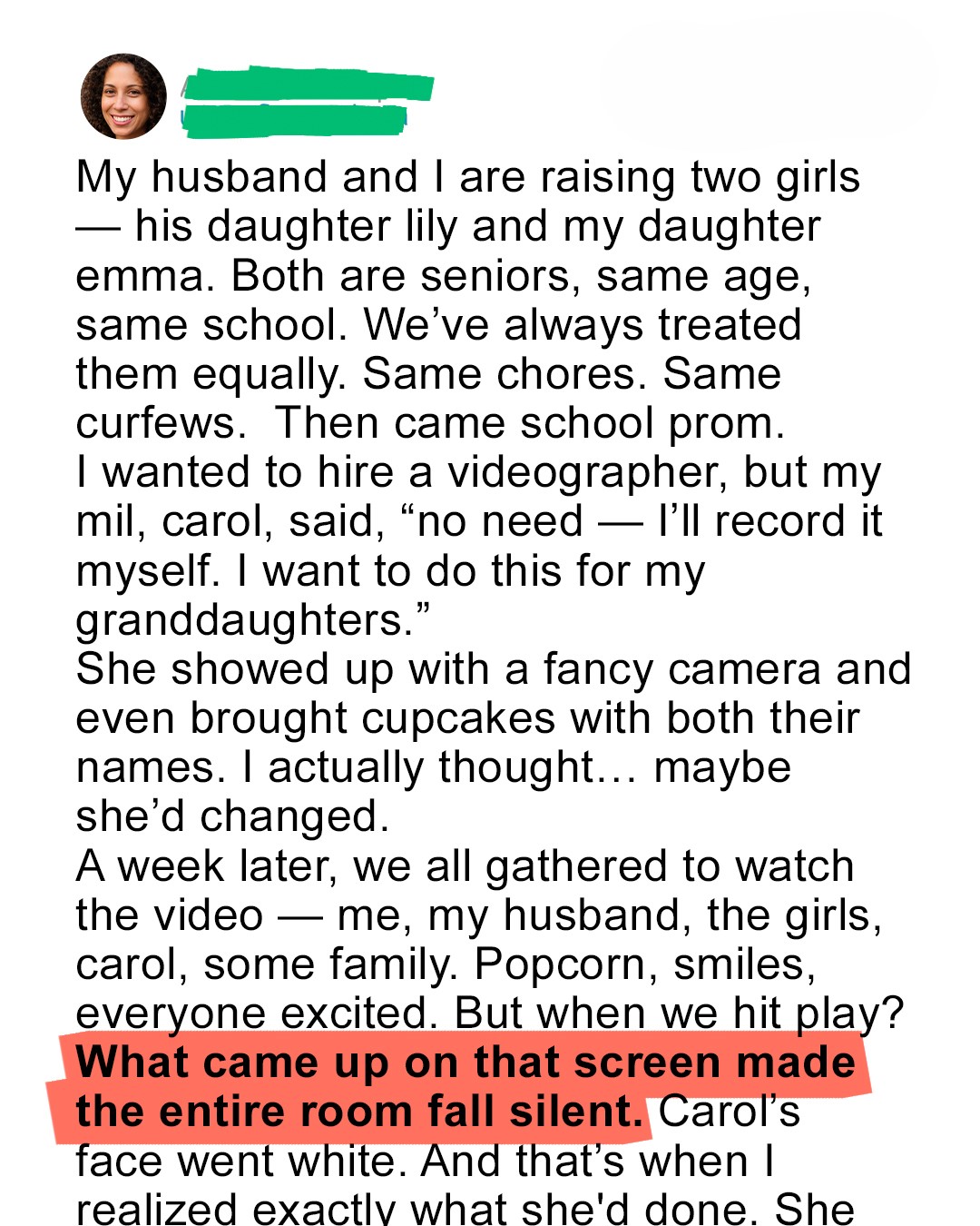 I told myself it would get better, that Carol just needed time to warm up to Emma.I was wrong.Prom night was approaching, and I was planning to hire a videographer. Lily and Emma were both seniors in the same school and I thought their big night deserved big memories, you know?But then Carol stepped in with uncharacteristic enthusiasm.“Oh please,” she said with a wave of her hand. “I have a great camera, and I want to do this for my granddaughters.”
