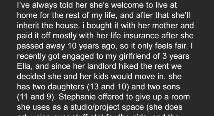 Stephanie, now 14, has had one of the two spacious rooms in this house with an ensuite bathroom since she was seven. It’s got a bright bay window, her mom’s favorite Boho curtains still hanging, and the only other private bath besides mine.I assured my daughter that room was hers for as long as she wanted it… and that one day, the whole house would be hers too.So when I got engaged to Ella, my girlfriend of three years, and she said her landlord jacked the rent, the move made sense. Well, sort of. She’s got four kids — two girls, 13 and 10, and two boys, 11 and 9.