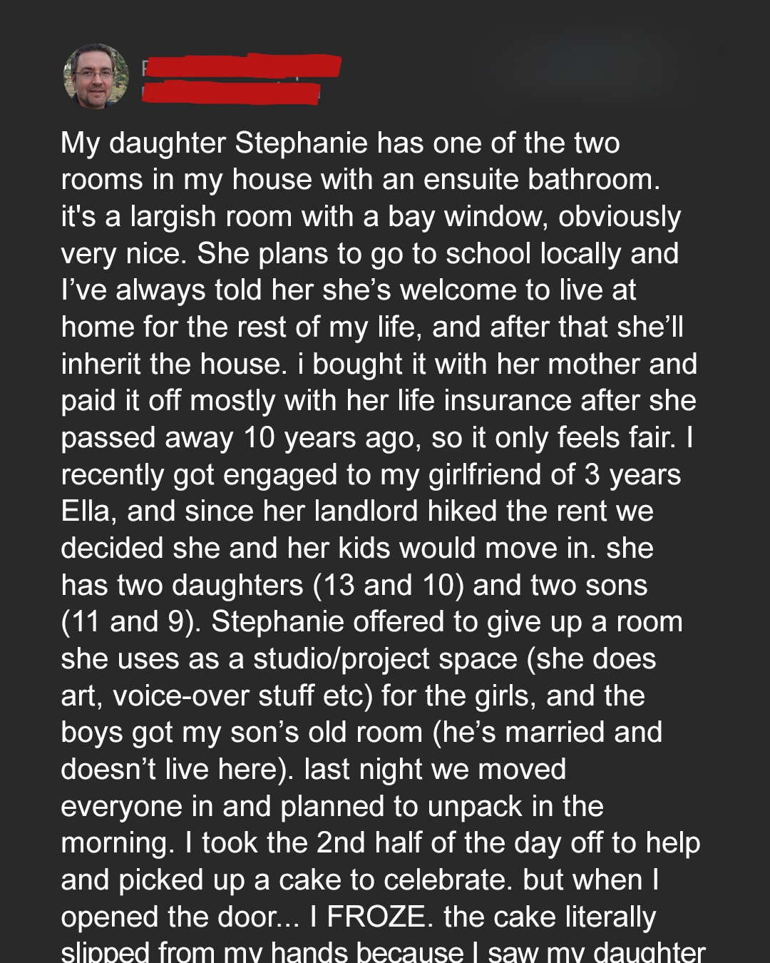 I promised my daughter one thing: nothing would change when my new wife and her kids moved in. But less than 24 hours after they arrived, I opened the front door, saw my daughter’s face… and everything stopped. Something had gone wrong. I just didn’t know how wrong until I rushed inside.I’m Johnny, 45, and if there’s one job I take seriously in this life, it’s protecting my daughter, Stephanie. She lost her mom to cancer 10 years ago, and since then, I’ve been her dad, mom, and her best friend.