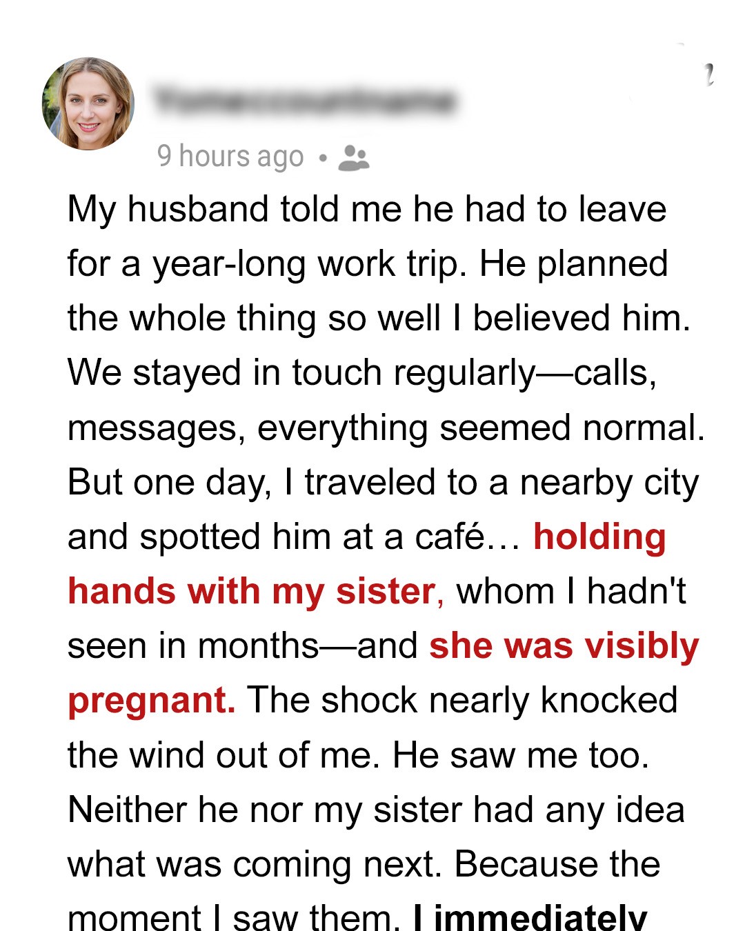 “Really?” I managed to croak out. “Because it looks like my husband, who’s supposed to be in Norway, is holding hands with my pregnant sister in a bakery 15 minutes from where she lives.”