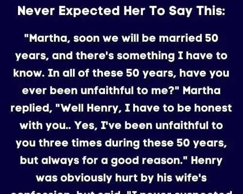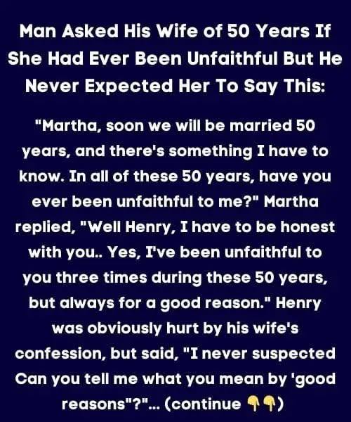 “Martha, soon we will be married 50 years, and there’s something I have to ever len unfaitte to mears, have you Martha replied, “Well Henry, I have to be honest with you.. Yes, I’ve been unfaithful to you three times during these 50 years, but always for a good reason.”
