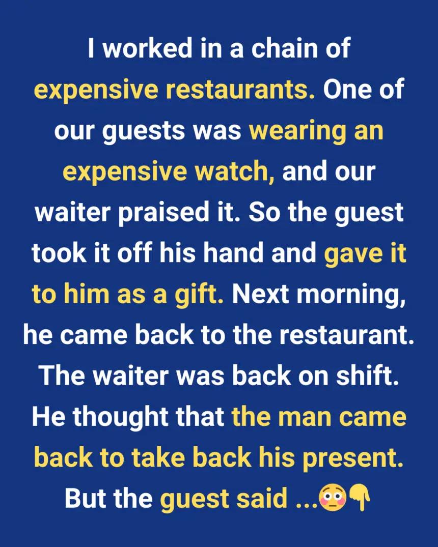 I worked in a chain of expensive restaurants. One day, one of our guests was wearing an expensive watch, and our waiter praised it.