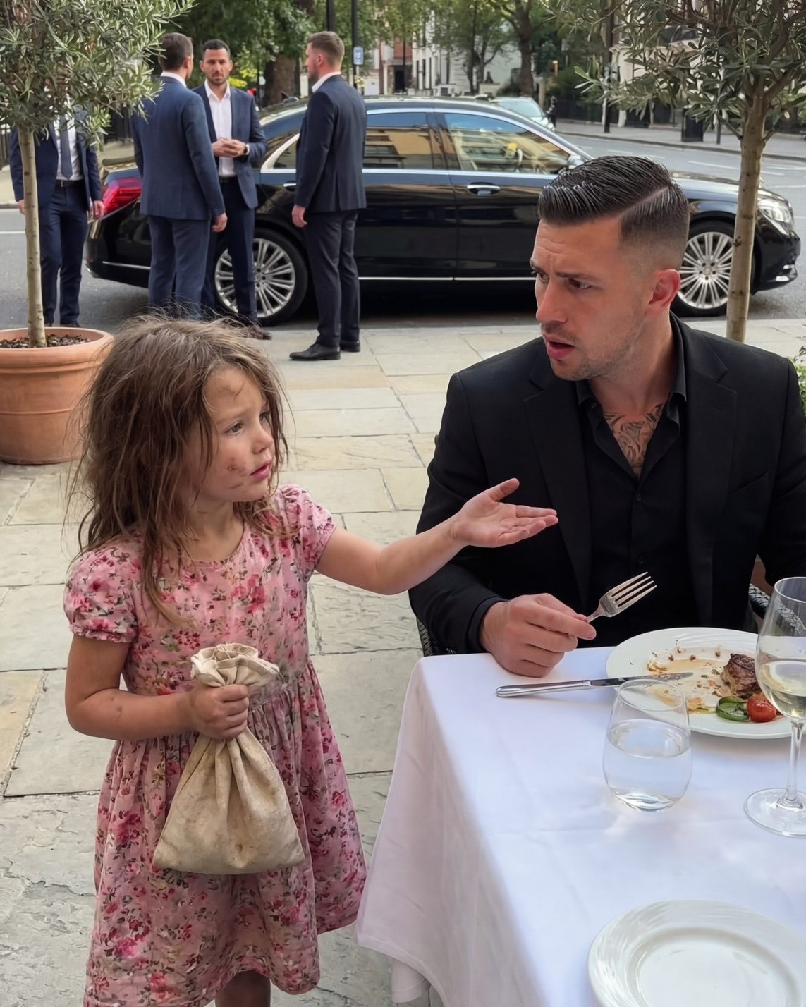 She couldn’t have been older than nine. Her clothes were soaked from the rain, hanging loosely from her thin frame. Her hair clung to her face, tangled and damp, and her cheeks were flushed from the cold.