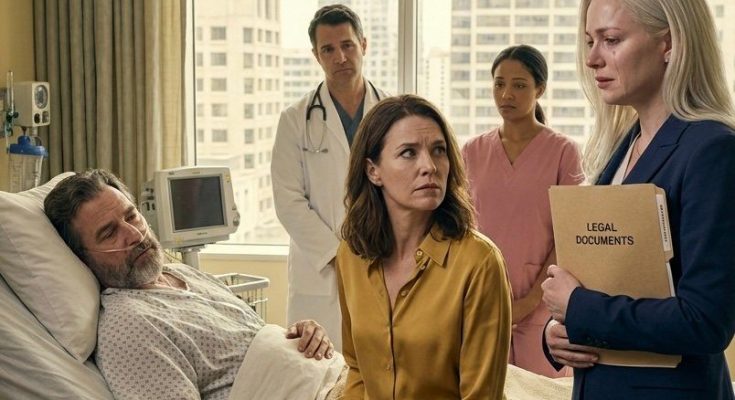 A blonde woman in a cream sweater sat beside his bed, her fingers intertwined with his.