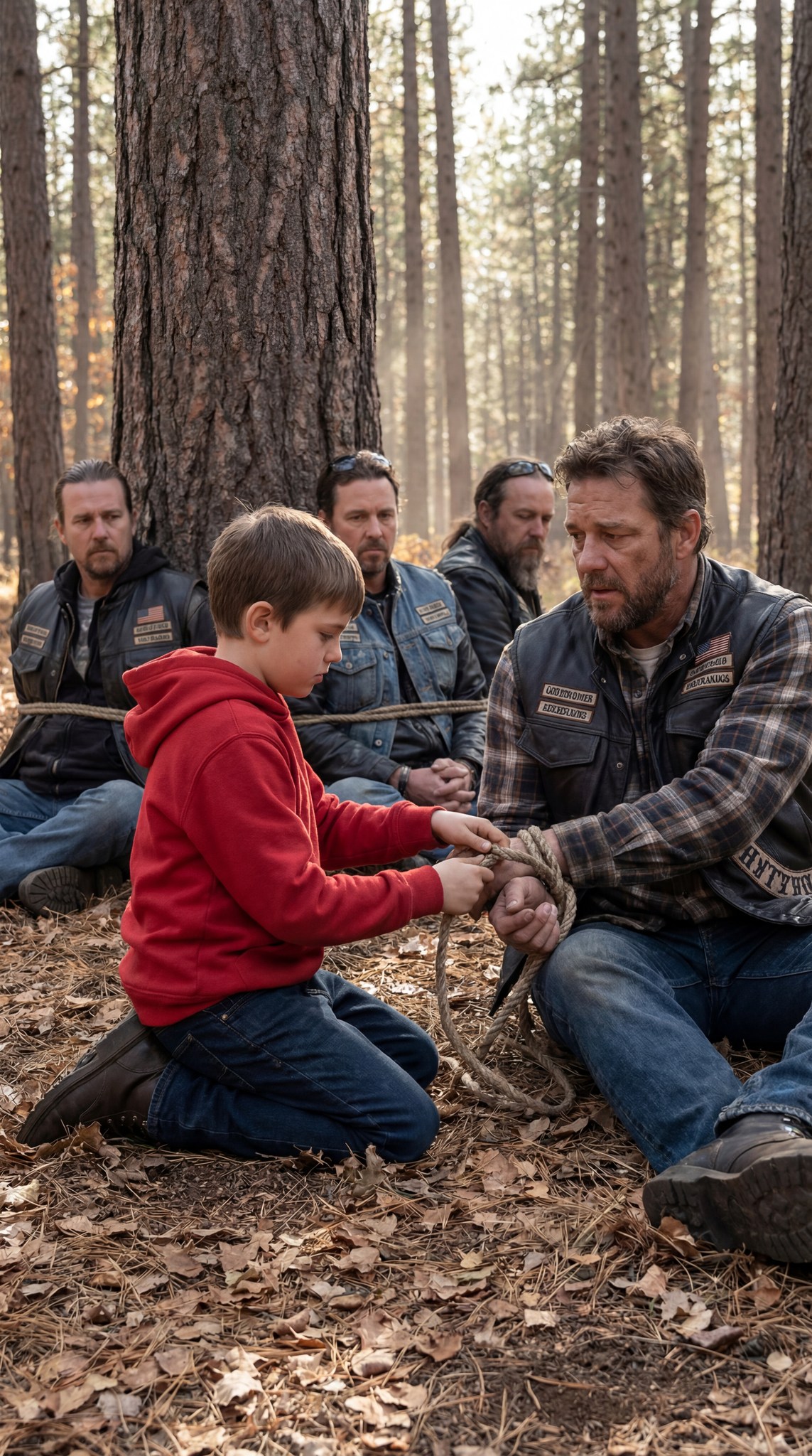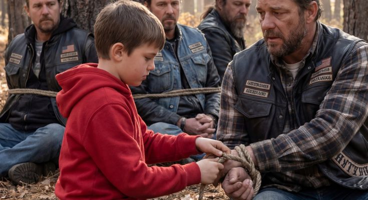 A Quiet 10-Year-Old Boy Wandered Deep Into the Woods and Found Four Bikers Chained to a Tree — Until One Weak Whisper Forced Him to Run Barefoot for Miles and Triggered a Response No One Expected